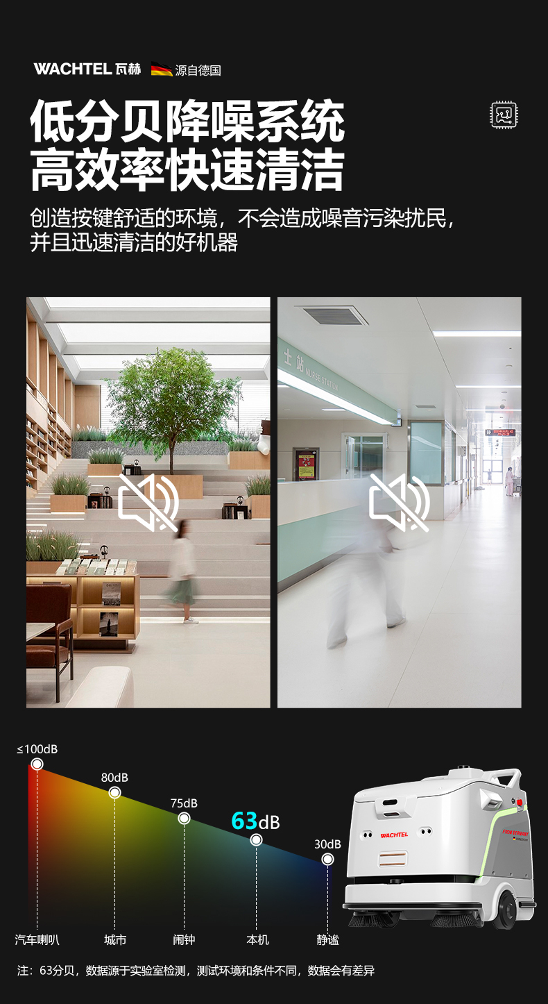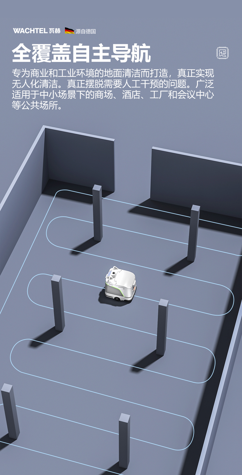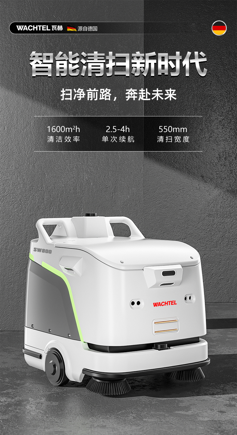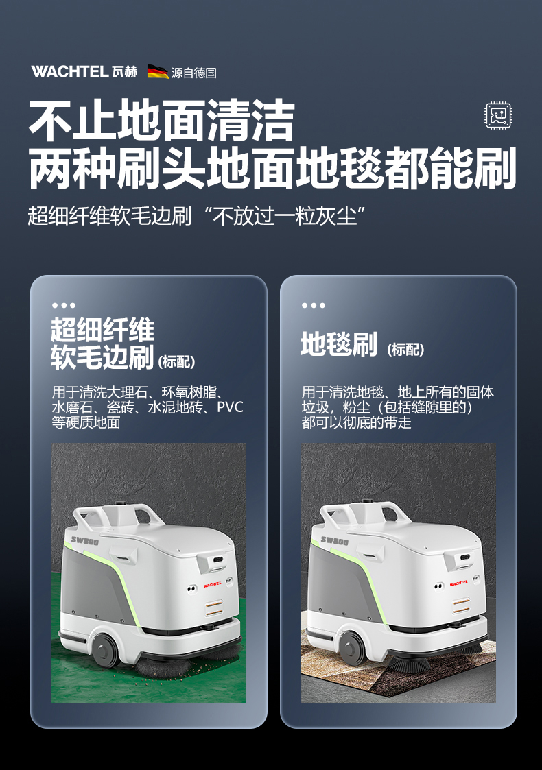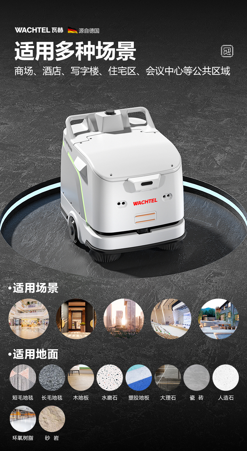 品牌:WACHTEL 名稱:掃拖吸一體智能機器人 型號:SW800 功能:掃地+洗地+吸塵+塵推 特點:自動充電+自動避讓+自動乘梯+斷點續掃 控制方式:自動/人工 外觀尺寸: 1020*847*915mm 充電樁尺寸:430*290*440mm 清潔寬度:600 mm 塵推寬度:800 mm 清潔效率:2300m²/h 工作時間:4h 工作噪音:≤63dB 電池:24V/50AH/100AH鋰電池 重量:150kg 防護措施:激光雷達+超聲探頭+深度攝像頭